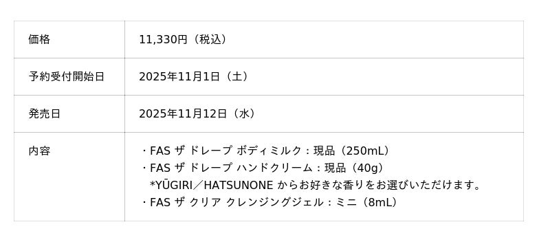 2025年10月に誕生する新シリーズ「FAS ザ ドレープ」より発売のボディクリーム&ハンドクリームがセットで登場。秋の終わりの幻想的なひとときをイメージした「YŪGIRI」と、静謐で凜とした空気の中に春を待つ草木の気配を重ねた「HATSUNONE」の2種の香りから、お好きな方をセットでお選びいただけます。コフレ限定で、クレンジングジェルのミニサイズもセットに。