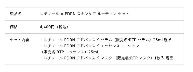 アモーレパシフィックジャパン株式会社(本社:東京都渋谷区)が展開する、大自然の無限のエネルギーを使用し健やかな美しさを切り拓く、自然主義アクティブスキンケアブランド [INNISFREE | イニスフリー]の渡韓美容に着目した美容液『レチノール PDRN アドバンスド セラム(販売名:RTP セラム) 』が発売からわずか1年で250,000本を突破*¹、ベストコスメ19冠を受賞*²するなど高い評価を得ています。お客様に感謝の気持ちを込めて、『レチノール×PDRNライン』のトラベルサイズの化粧水やマスクシートがついたお買い得な限定キットを2025年9月1日(月)より全国発売いたします。