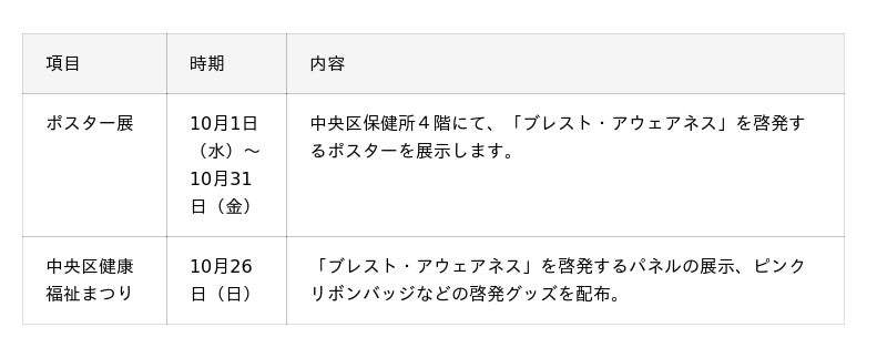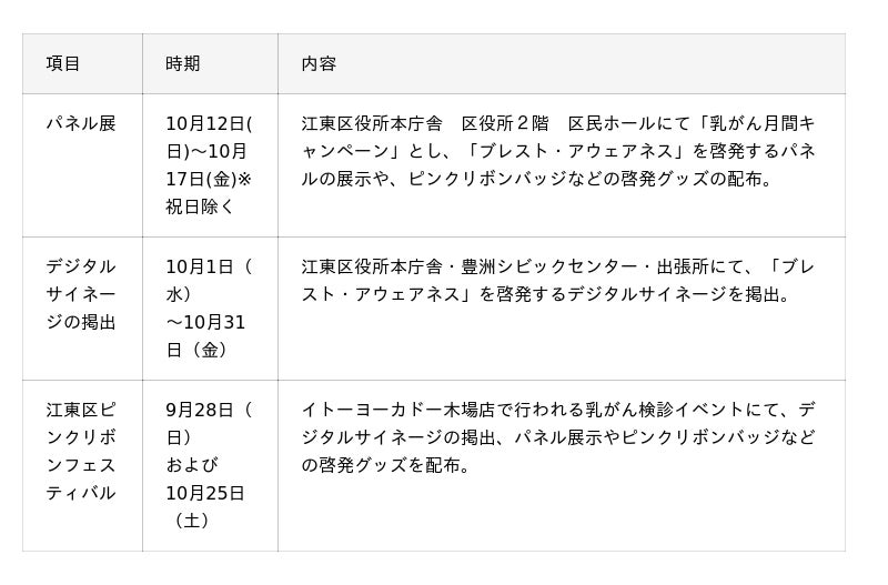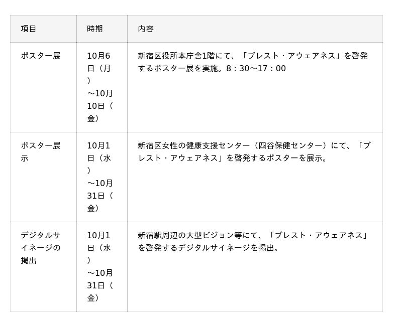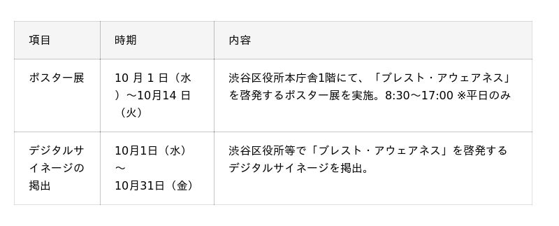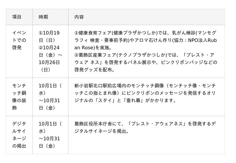 今年も「ブレスト・アウェアネス」の啓発に注力しており、東京都・葛飾区・江東区・渋谷区・新宿区・中央区・横浜市等で「ブレスト・アウェアネス」を啓発するパネル展示を実施する他、渋谷区・新宿区では啓発動画を駅周辺のデジタルサイネージにて掲出予定です。また、葛飾区では、新小岩駅北口駅前広場内のモンチッチ銅像にピンクリボンのメッセージを発信する装飾が施されます。