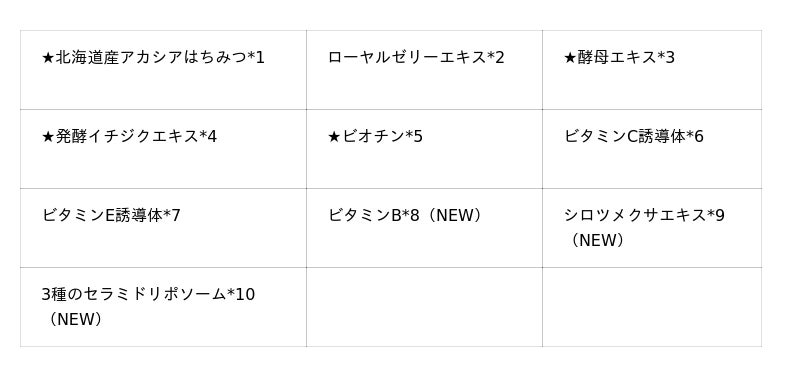 ※1 ハチミツ(保湿成分) ※2 ローヤルゼリーエキス(整肌成分) ※3 酵母エキス(整肌成分) ※4 シゾサッカロミセス/イチジク果実発酵液(整肌成分) ※5 ビオチン(整肌成分) ※6 テトラヘキシルデカン酸アスコルビル(整肌成分) ※7 トコフェロール(整肌成分) ※8 パンテノール(整肌成分) ※9 シロツメクサエキス(整肌 成分) ※10 セラミドAP、セラミドNG、セラミドNP(保湿成分)