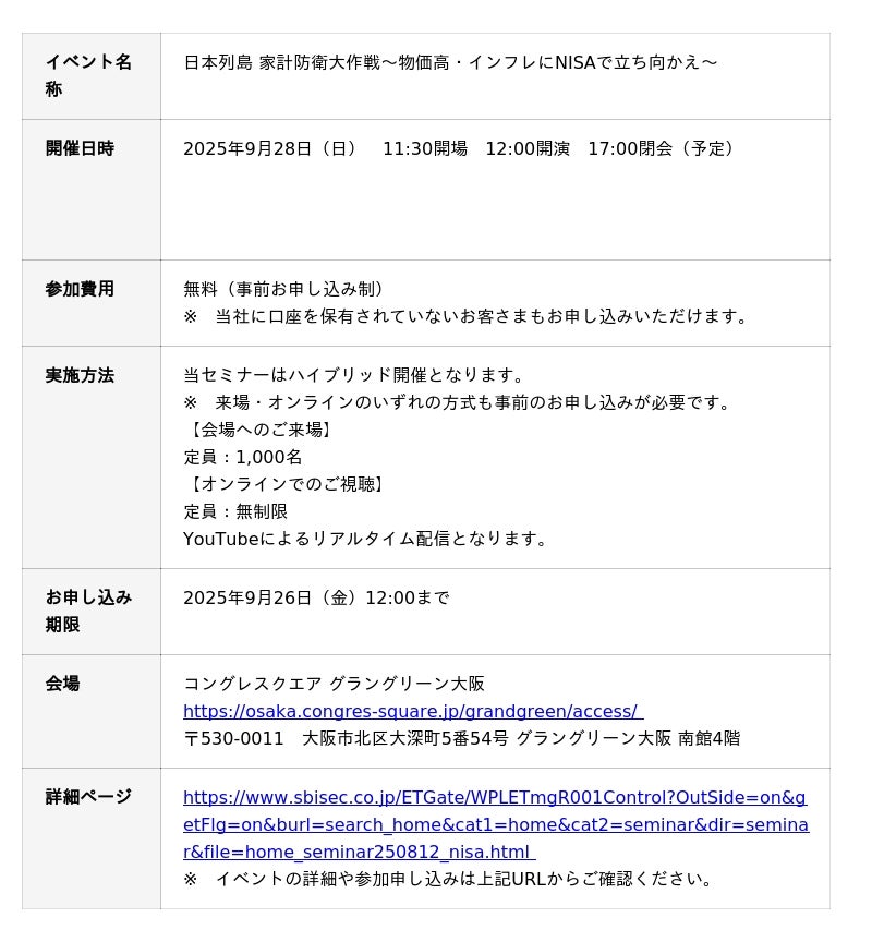 株式会社SBI証券(本社:東京都港区、代表取締役社長:高村正人、以下「当社」)は、ハイブリッド型(会場+オンライン中継)イベント「日本列島 家計防衛大作戦~物価高・インフレにNISAで立ち向かえ~」を2025年9月28日(日)にコングレスクエア グラングリーン大阪にて開催しますのでお知らせします。