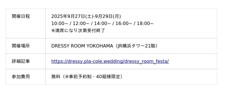「PLACOLE & DRESSY」ブランドを展開する冒険社プラコレ(本社:神奈川県鎌倉市、代表取締役CEO:武藤功樹)は、横浜駅直結JR横浜タワー21F、ウェディングの魔法にかかる空間"DRESSY ROOM YOKOHAMA"にて、9/27(土)-9/29(月)の3日間限定で、これから結婚式をお考えのカップル様に向けた、個室相談やウェディングドレス試着ができる豪華特典付きのウェディング初体験フェスを開催いたします。(40組様限定、無料開催)