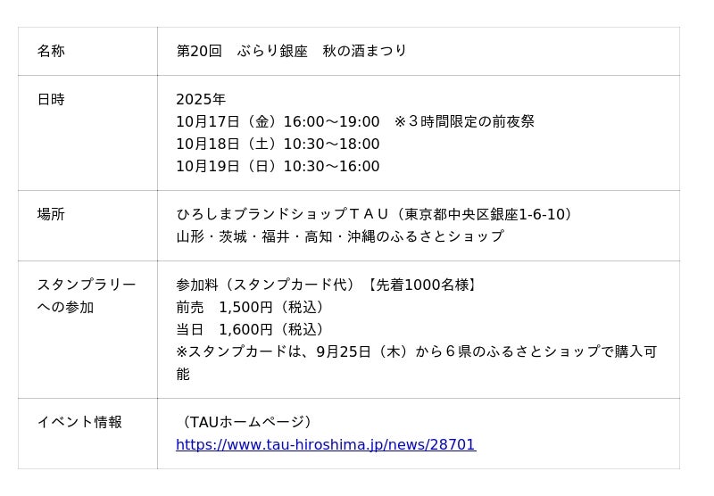 【日程】10月17日(金)~19日(日) 【場所】ひろしまブランドショップTAU(東京都中央区銀座1-6-10)山形・茨城・福井・高知・沖縄のふるさとショップ