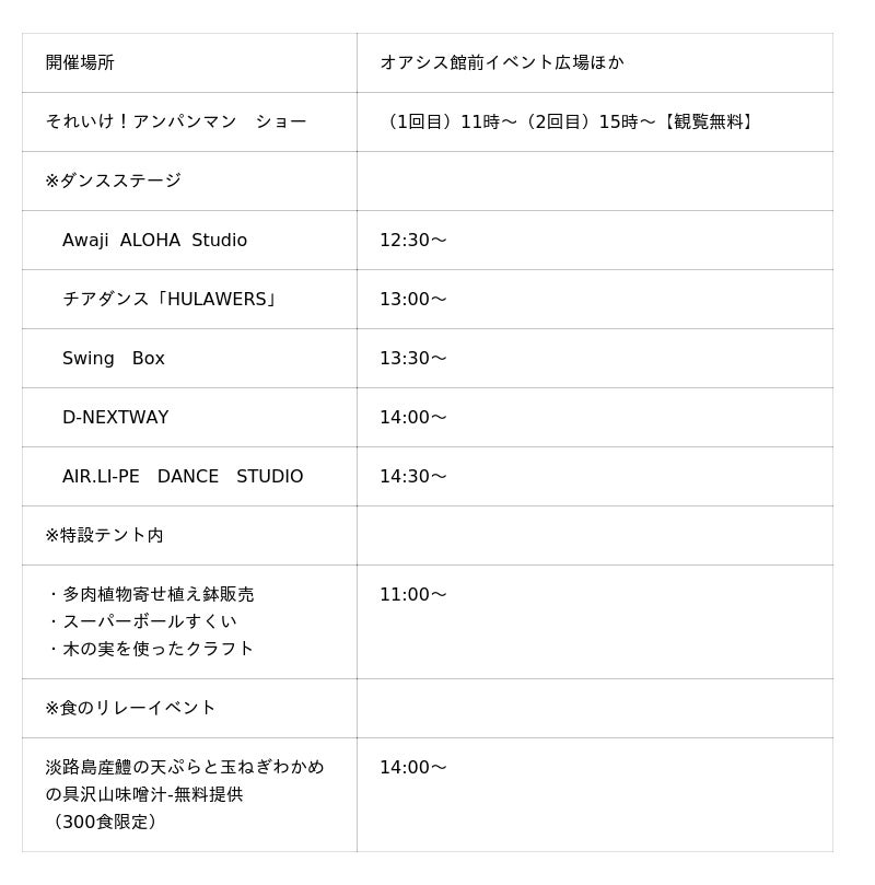 淡路ハイウェイオアシス人気イベント「オアシス秋祭り」を2年連続開催!「それいけ!アンパンマン ショー」「淡路島産鱧の天ぷらと玉ねぎわかめの具沢山味噌汁300食限定無料提供」「ダンスステージ」など