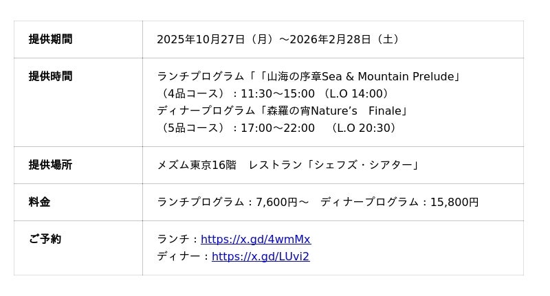 東京の躍動感や波長と共鳴し、上質な空間でクリエイティブな体験ができるモダンラグジュアリーホテル『メズム東京、オートグラフ コレクション』(港区海岸1-10-30/総支配人 生沼 久)は、16階フレンチダイニング「シェフズ・シアター」にて、2025年10月27日(月)から2026年2月28日(土)まで(※12月24日(水)・25日(木)を除く)、秋から冬へと移ろう季節を一皿ごとに表現したダイニングプログラムを、ランチ「山海の序章 Sea & Mountain Prelude」とディナー「森羅の宵 Nature’s Finale」と銘打ち、コースメニューにてご提供します。「海山の恵み」をテーマに、国産食材を中心に構成し、キュリナリーマイスター 隈元 香己が愛する蝦夷鹿や野田鴨をメインに据えつつ、素材を最大限に活かした内容に仕上げます。森の滋味と海の恵みを美しい演出とともに上質な一皿ひとさらへと昇華いたします。