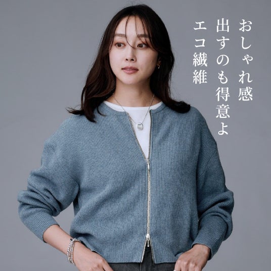一部にリサイクル繊維を使用したウールと、リサイクル・ナイロンをミックスし、軽さや膨らみが出せるトップ染色で紡績されたイタリア「MILLEFILI 社」の紡毛糸を使ったニット。ボトムスとのバランスが抜群の少しゆったりとしたサイジングと短めの着丈で、スタイルアップも実現。トレンド感あふれる逆開きファスナーは、下を少し開けてインナーをのぞかせるなど、レイヤードスタイルにヌケ感とこなれ感を演出してくれます。