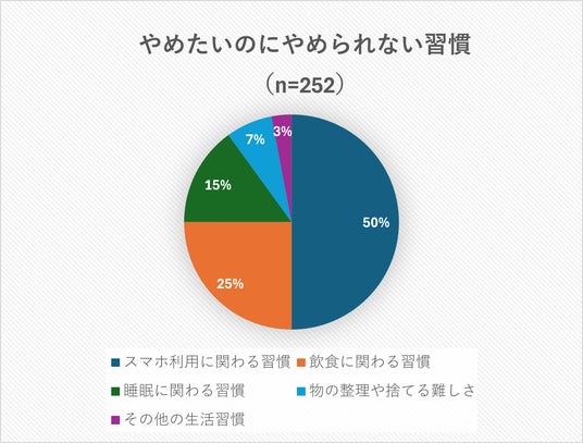 調査結果によると、「やめたいのにやめられない習慣」の中でも、5割の読者が「スマホに関する利用習慣」について悩んでいるとのこと。そのなかで、とくに多かった習慣が「スキマ時間にだらだらスマホを見て時間を無駄にしてしまう」、次に「寝る前にスマホを見るのをやめたいけどつい見てしまう」が続くという結果になりました。