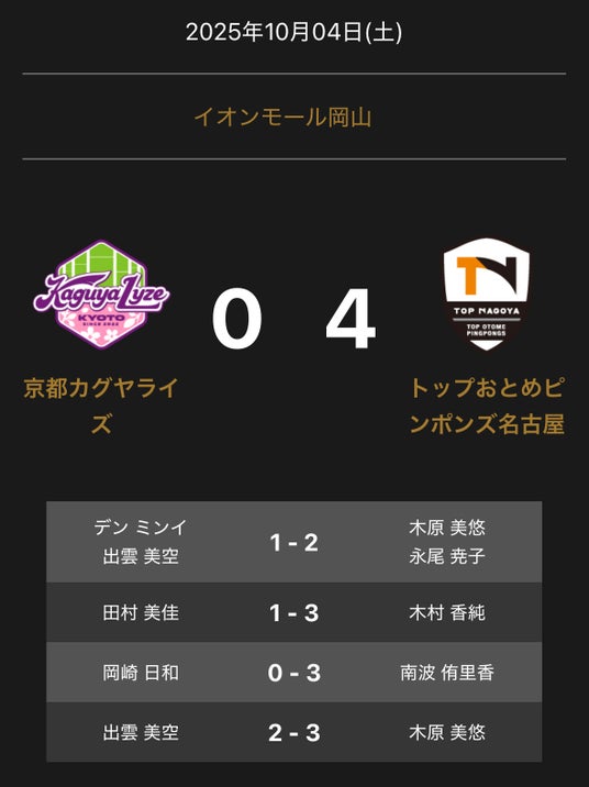 ノジマTリーグ 2025-2026シーズン 公式戦 10月4日開催 京都カグヤライズ vs トップおとめピンポンズ名古屋の試合は、0-4でトップおとめピンポンズ名古屋が勝利しました。