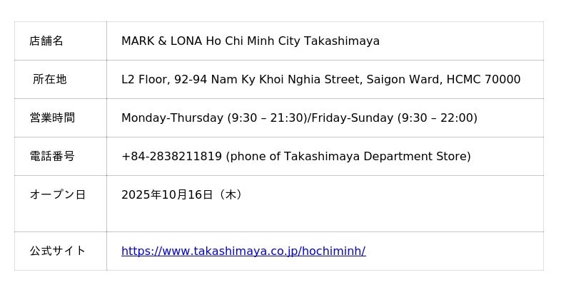 株式会社キューブが展開するゴルフアパレルブランド「MARK & LONA(マーク&ロナ)」は、2025年10月16日(木)、ベトナム・ホーチミン高島屋に新店舗をオープンいたします。これにより、アジア市場でのブランドプレゼンスをさらに拡大し、グローバルにMARK & LONAの世界観を発信してまいります。