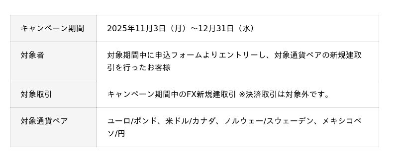 松井証券株式会社(本社:東京都千代田区、代表取締役 社長執行役員:和里田 聰、以下「当社」)は、2025年11月3日(月)より、外国為替証拠金取引(FX)において、自動売買で人気の4通貨ペアを対象とした最大400万円のキャッシュバックキャンペーンを実施いたします。