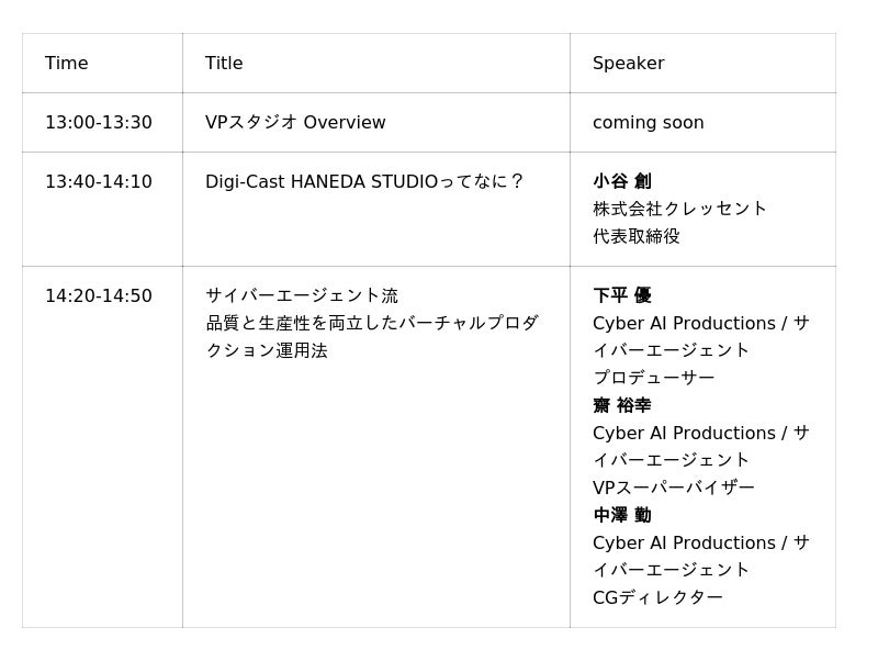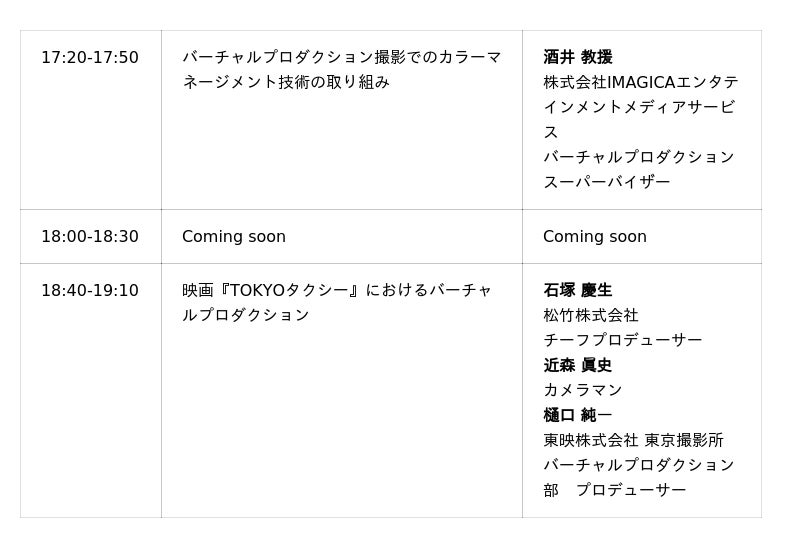 DAY1ではサイバーエージェント、NHK、IMAGICAエンタテインメントメディアサービスなど、業界を牽引する豪華登壇者が集結。NHK大河ドラマにおけるバーチャルプロダクション活用の展望や、サイバーエージェントが独自に取り組むバーチャルプロダクション撮影や背景制作におけるAI活用の取り組みなど、品質と生産性を両立させるための実践ノウハウに迫ります。