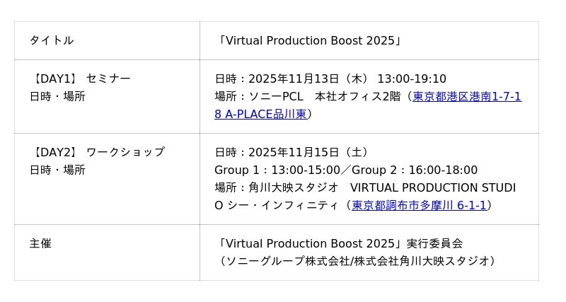 11月13日(木)・15日(土)の2日間にわたりソニーグループと角川大映スタジオが共同で開催する、バーチャルプロダクション(以下VP)業界の最前線を体感する祭典「Virtual Production Boost 2025」。セミナーとワークショップの詳細が決定しました。