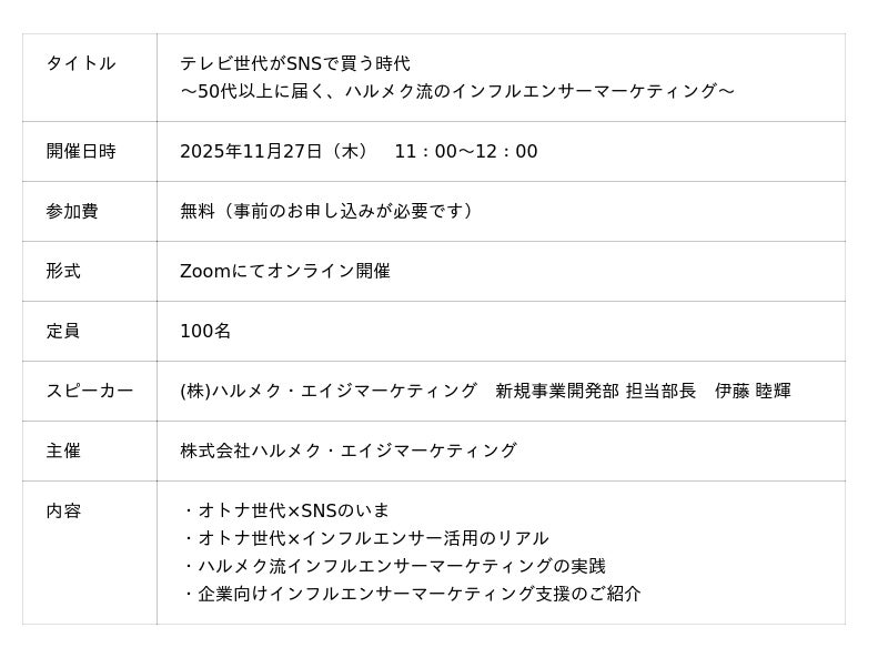HALMEK up アンバサダーの活動を通じて見えてきた「オトナ女性のSNS活用のいま」を、企業担当者の皆さまに知っていただくために、無料のオンラインセミナーを開催します。ハルメクグループがこれまで取り組んできた事例を交えながら、SNSで50代以上の共感を生む発信のヒントをお伝えします。