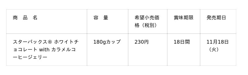 スターバックス・コーポレーション(本社:米国 シアトル、CEO:ブライアン・ニコル)と、サントリー食品インターナショナル株式会社(本社:東京都、社長:小野真紀子)は、スターバックスのチルドカップシリーズより「スターバックス(R) ホワイトチョコレート with カラメルコーヒージェリー」を、11月18日(火)から全国のファミリーマートにて期間限定で発売します。