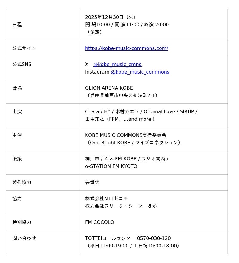 イベントの詳細やアリーナ併設の飲食店舗などの情報は、イベントオフィシャルサイト(https://kobe-music-commons.com/)をご確認ください。