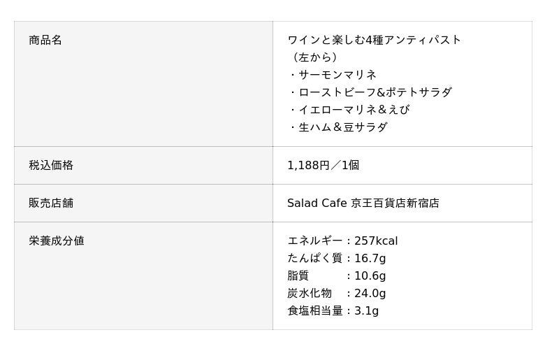 ケンコーマヨネーズ株式会社(所在地:東京都杉並区、代表取締役社長:島本 国一)の100%子会社であるサラダカフェ株式会社(所在地:大阪府吹田市、代表取締役社長:石井 健夫、以下「サラダカフェ」)は、百貨店やショッピングモールを中心に、彩り豊かなサラダや総菜を販売するサラダショップを展開しています。11月20日(木)のボジョレー・ヌーヴォー解禁に向け、ワインにぴったりなメニューとして、関東店舗では11月12日(水)、関西店舗では11月19日(水)発売の「カマンベールと生ハムのポテトサラダ~ドライフルーツ入り~」と、11月19日(水)発売の「ワインと楽しむ4種アンティパスト」をご紹介します。