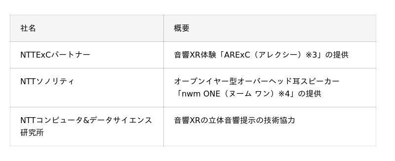 「音響XR」は、空間上の音源を仮想的に3次元的に配置して、現実の環境音とバーチャル空間の音とを自然に融合させるNTTグループの音響技術です。「音響XR」がデジタル上の仮想世界の演出に加わることにより、参加者は、あたかもキャラクターが実際にそこに存在しているような、立体的な聴覚体験ができます。今回は、NTTソノリティが提供するオープンイヤー型オーバーヘッド耳スピーカー「nwm ONE(ヌーム ワン)」を用いた新たな演出として、会場のスピーカーから流れる環境音とヘッドホンから流れる音の演出のそれぞれが、耳をふさぐことなく融合する聴覚体験を、期間限定でお楽しみいただけます。