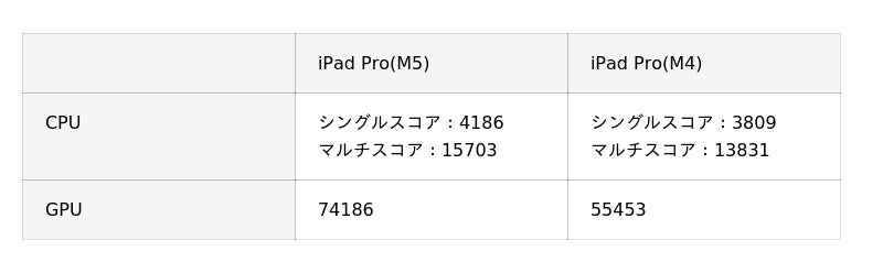 M5チップとなったiPad Proは、処理能力が更にパワーアップ。また、M4チップには搭載されていない「Neural Accelerators」がGPUに組み込まれました。