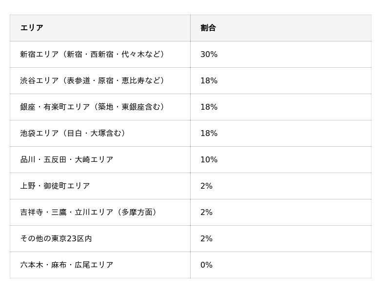 一方で六本木・麻布エリアは0%と、比較的高価格帯の地域は利用者が少ない傾向にあります。