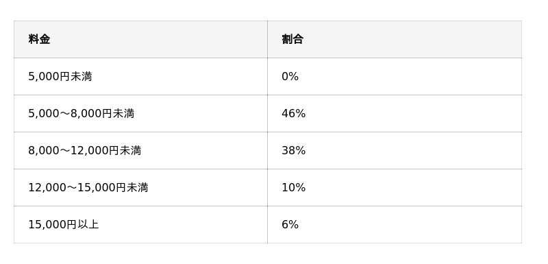 次いで 8,000~12,000円(38%) と続き、1万円前後が相場帯であることが分かります。
