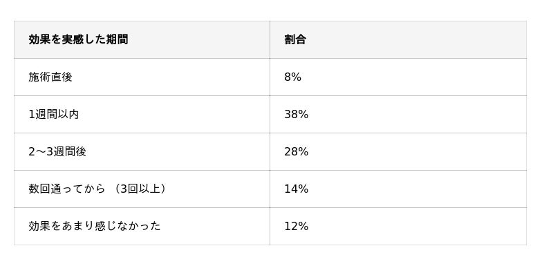 また 「2~3週間後」も28% と、施術後すぐ~数週間で変化を感じる人が多数派でした。