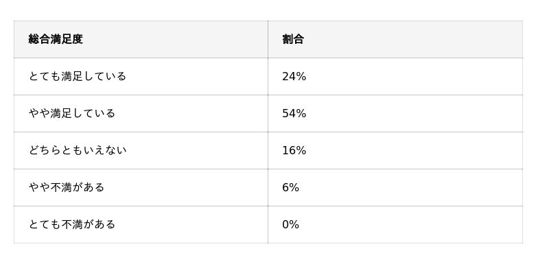 満足度は全体として高く、「とても満足」24% +「やや満足」54% = 78%が肯定的評価 という結果になりました。