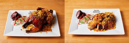 皮がカリカリになるまで揚げ焼きにした若鶏に、スパイスを効かせた香り高いパン粉をまとわせました。濃厚な味わいの、鶏レバーのチャーシューを添えて。