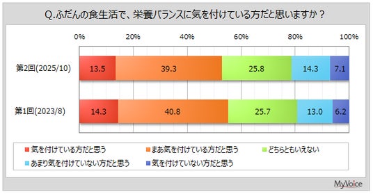 マイボイスコム株式会社(東京都千代田区、代表取締役社長:高井和久)は、2回目となる『栄養バランス』に関するインターネット調査を2025年10月1日~7日に実施しました。