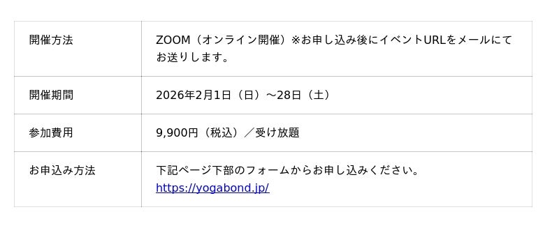 創業19年目を迎えるヨガに特化したWebメディアやヨガインストラクター向けセミナーサイト「ヨガジェネレーション」を運営する株式会社オハナスマイル(本社:東京都目黒区祐天寺2-9-4 虎ノ門ビル2F 代表取締役:酒造博明)は、2026年2月1日(日)~2月28日(土)の1ヵ月間、オンラインヨガイベント「YOGABOND(ヨガボンド)」を開催することを発表しました。各講師陣によるオンラインクラスの他、ワークショップや特別対談企画など、ヨガクラスに留まらないスペシャルコンテンツをご用意しています。