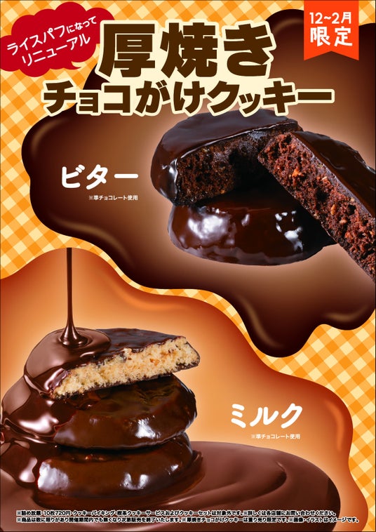 「厚焼きチョコがけクッキー」は、厚焼きにしたクッキーにチョコをコーティングしたずっしり満足感のある冬期限定のクッキーで、例年好評をいただいております。展開3年目の本年は、サクサク感と香ばしさを追求しライスパフを生地に加えてリニューアルいたしました。