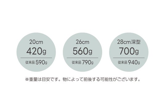 当社の従来品(同サイズ・IH 対応のもの)よりも平均200g ほど軽くなりました。