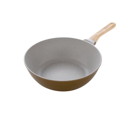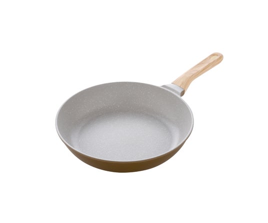 内側は大理石調のグレー、外側はザラッとした質感のゴールドに仕上げ、ナチュラルでありながら落ち着いた印象に。ハンドルはウッドテクスチャの樹脂製で、やさしい風合いと日常使いに耐える丈夫さを両立しています。