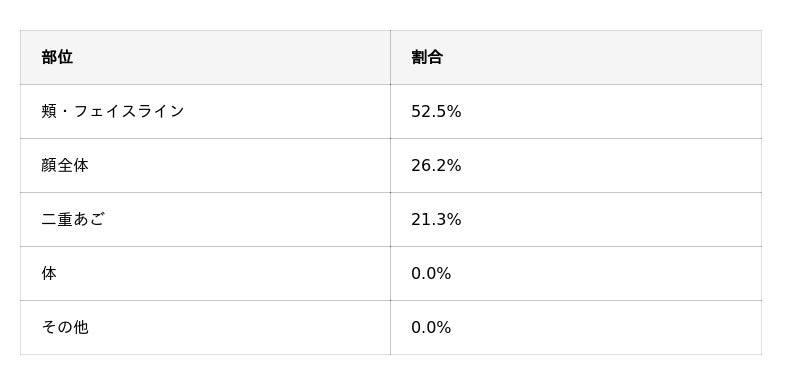 - 頬・フェイスラインを施術した人が全体の約5割で最多