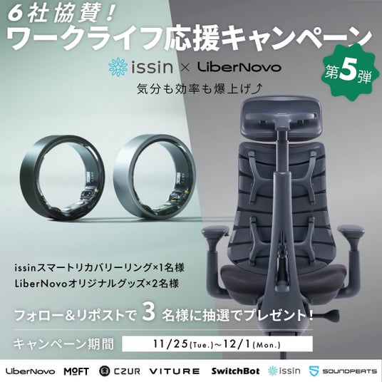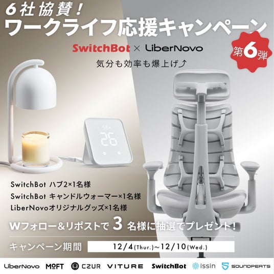 長年エンジニアとしてのユーザー視点と確かな技術力で、新たなワークライフを創る新鋭ワークチェアメーカーLiberNovo(リベルノヴォ、本社:中国香港、CEO:王 振旭)が開発した、現在Makuakeにて公開中の電動ワークチェア「LiberNovo Omni(リベルノヴォ オムニ)」プロジェクトを通して開催中の超大型企画「LiberNovo主催 6社協賛、ワークライフ応援キャンペーン」について、第5弾:AIの力で健康に寄り添う「issin」、第6弾:スマートホーム業界の先駆け「SwitchBot」協賛の豪華なキャンペーン内容を発表いたします。