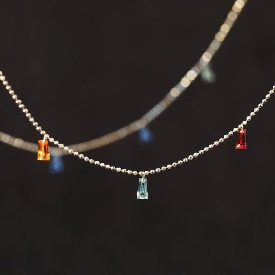 カットボールチェーンにテーパーカットサファイアを組み合わせた「Tassel Necklace(タッセルネックレス)」も並びます。地金の枠を用いず、サファイア本来の澄んだ輝きが軽やかに素肌を彩ります。