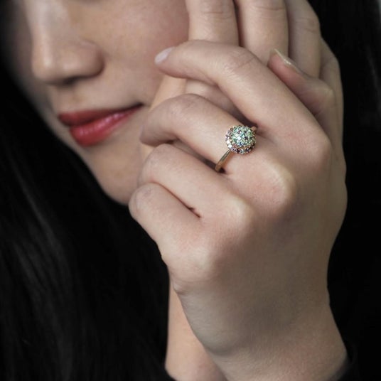 サイズや種類の異なるメレサイズの宝石を、隙間なく敷き詰めて仕立てたパヴェリング。大人の指元にふさわしい立体感と贅沢な光を湛えた「Pomponne Mosaic(ポンポネ モザイク)」に、ホリデーシーズンを彩る新色が登場いたします。