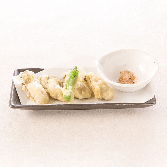 国内の牡蠣の王道・広島県産の牡蠣を外はカリッと、中はぷりぷり食感の天ぷらでお楽しみください。七味塩が絶妙な味を醸し出します。