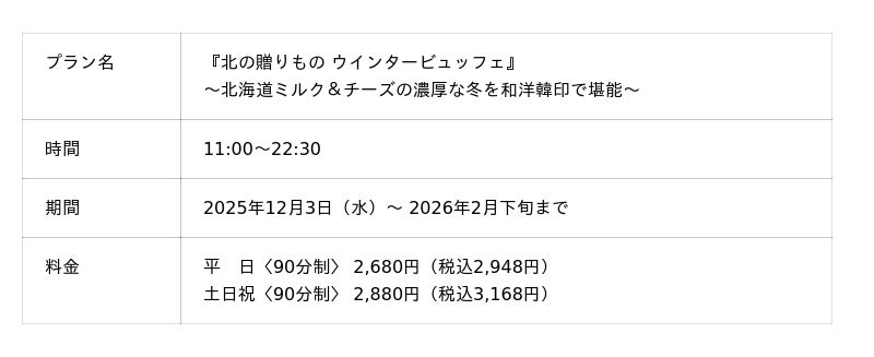 ■ 北海道ミルク&チーズの濃厚な冬を味わう『北の贈りもの“ウインタービュッフェ”』では、北海道産ミルクやチーズを贅沢に使った濃厚な冬メニューを“和洋韓印”の4ジャンルで堪能できる構成に仕上げました。シェフが各国の調理技法を生かして多彩にアレンジ。