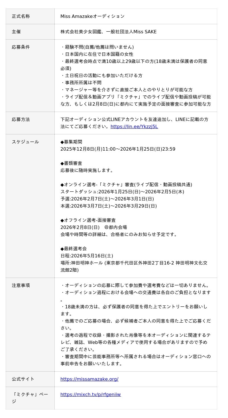 株式会社美少女図鑑(東京都渋谷区、代表取締役:中村孔亮)が運営する地域密着型メディア『美少女図鑑』は、一般社団法人Miss SAKE(東京都港区、代表理事:大西美香)と共同で、日本の伝統文化と醸造文化(甘酒)をテーマにした新プロジェクト「Miss Amazake(ミス アマザケ)」オーディションを初開催することを決定しました。現在、「2026 Miss Amazake」へのエントリーを受付中です。【募集期間:2025年12月8日(月)11:00~2026年1月25日(日)23:59】