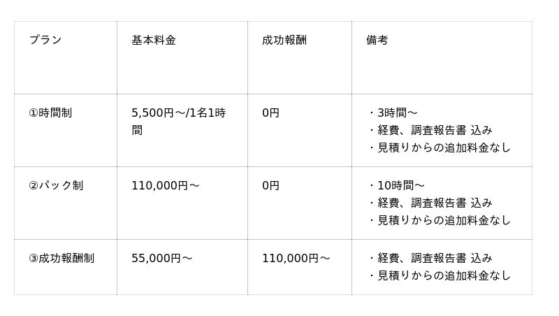 下記プランは、一般的な料金表です。調査料金はご相談者様の調査目的や環境により変動いたします。正式なお見積りは、ご面談やお電話等で詳細をご確認させていただいた上で、ご提示させていただきます。