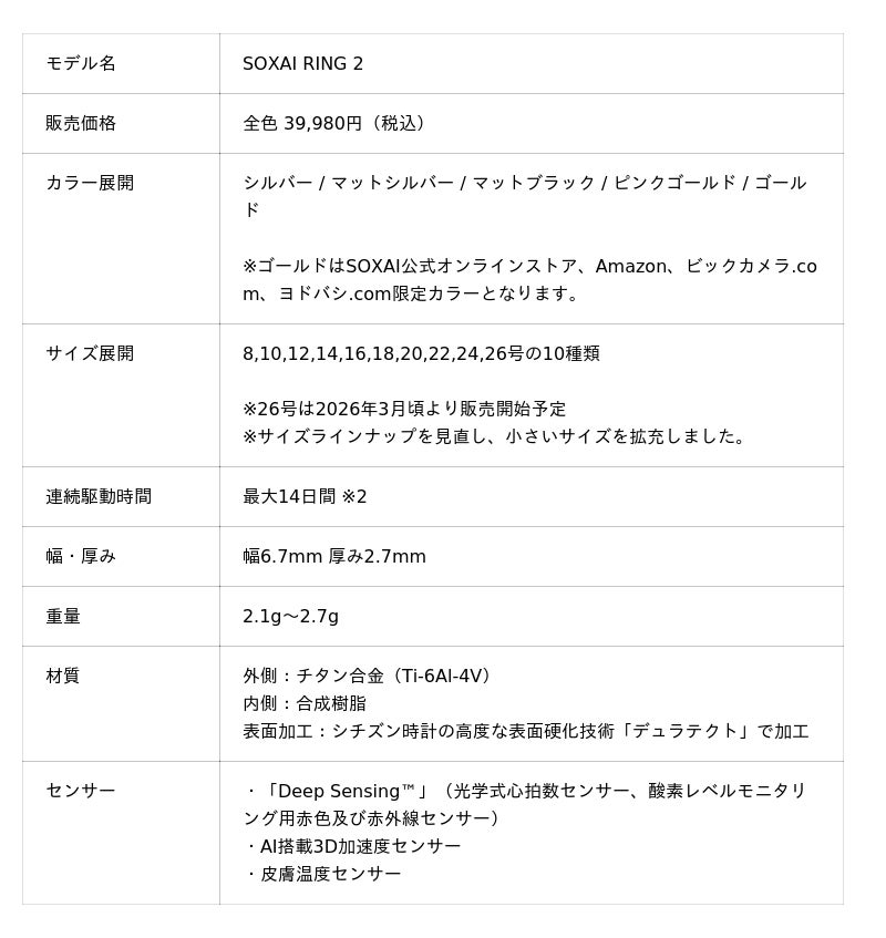 ※2 世界最長:「バイタルセンシング機能を搭載した連続駆動時間4日以上のスマートリング」を開発する主要スマートリングメーカーの公開情報をもとに比較。サイズごとに搭載しているバッテリーは異なり、14日間は20~26号の場合です。リングサイズと使用状況、ファームウェアバージョン、バッテリーの経年劣化によって変化します。(SOXAI調べ、2025年12月10日時点)