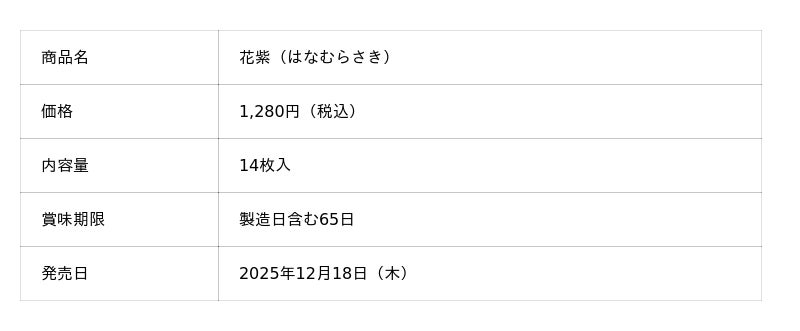 米粉を加え、花のようにひらりと軽い食感に仕上げたあずきのラングドシャは、MIYUKAのロゴをかたどった愛らしい花形が特長です。あずきのやさしい風味が広がる「花紫」は、皆で分けやすい、東京土産にも最適な14枚入りとなっています。MIYUKA グランスタ東京店、MIYUKA エキュート秋葉原店の2店舗限定で販売します。