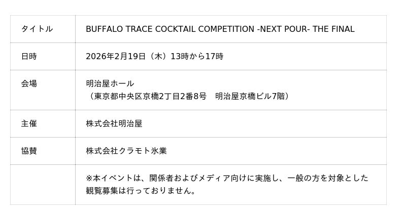 株式会社明治屋(本社:東京都中央区)は、2026年2月19日(木)に「伝統と革新」をテーマとした『BUFFALO TRACE COCKTAIL COMPETITION -NEXT POUR- THE FINAL』を開催いたします。