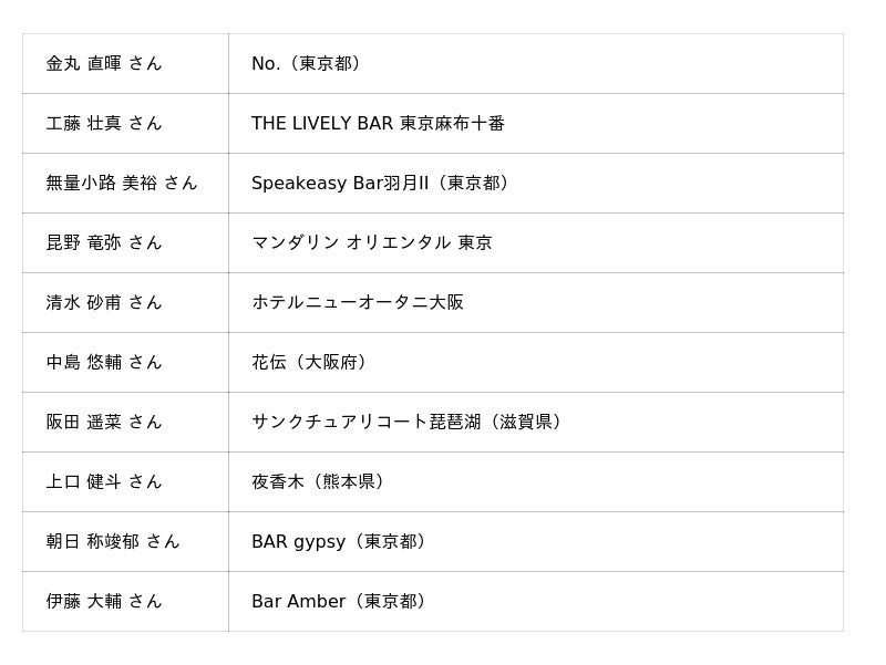 味わい・バランス・創造性・テーマ性などを総合的に評価し、次世代を担うバーテンダーたちの個性豊かなレシピが寄せられた中から選出された、10名のファイナリストです。(順不同)