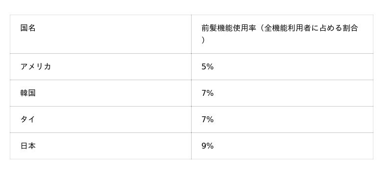 他国と比べ、日本の使用率は約2%高く、前髪機能の活用傾向が比較的高いことがわかります。
