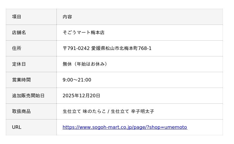 株式会社ヤマトバイオレッツ(本社:福岡県大野城市/ふくやグループ/代表取締役:梁川 剛一)は、愛媛県松山市のそごうマート梅本店(所在地:愛媛県松山市)にて、2025年12月20日より「生仕立て 味のたらこ」「生仕立て 辛子明太子」の追加販売を開始いたします。