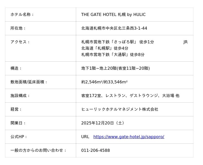 ヒューリックホテルマネジメント株式会社は、 本日2025年12月20日(土)に「THE GATE HOTEL 札幌 by HULIC」(北海道札幌市中央区北三条西)を開業いたしました。