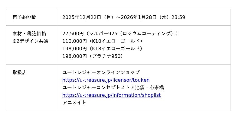 株式会社ユートレジャー(本社:東京都新宿区、代表取締役社長:青木 興一、株式会社ケイ・ウノの連結子会社)は、PCブラウザ・スマホアプリゲーム「刀剣乱舞ONLINE」とコラボレーションした「フォークリング(指輪)第三弾」の予約受付を2025年12月22日(月)~2026年1月28日(水)の期間、ユートレジャーオンラインショップ、ユートレジャーコンセプトストア池袋・心斎橋にて行います。