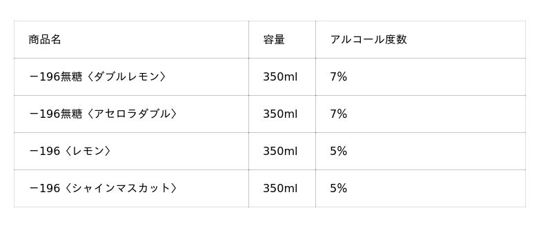 「-196」は、2005年発売のロングセラーブランドで、当社独自の“-196℃製法”を使用しています。なかでも「-196無糖」シリーズは、無糖でありながら果実本来の味わいをすっきりとした後味で楽しめる中味に高い評価をいただき、1-9月の販売数量は対前年150%と極めて好調に推移しています。また、今年7月に発売した“果物がおいしいチューハイ”「-196」シリーズは、今の時代の新スタンダードチューハイを目指し、約2年間にわたる調査で得られたRTDへのお客様のニーズを基に開発を進めた商品です。発売以来、果物のみずみずしい味わいや、爽やかなパッケージにもご好評いただいています。□今回の対象商品