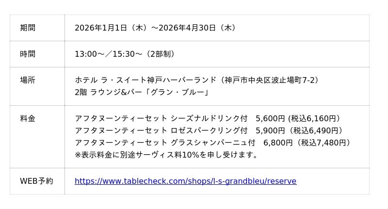 ホテル ラ・スイート神戸ハーバーランド(総支配人:檜山 和司 所在地:神戸市中央区)では、2026年1月1日から4月30日までラウンジ&バー グラン・ブルーで「Strawberry Afternoon Tea」を提供いたします。